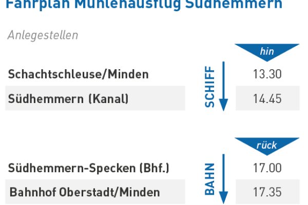 | Wichtige Informationen | Start: Anleger Schachtschleuse / Minden (Sympherstraße) Ziel: Die Fahrt endet am Bahnhof in der Oberstadt. Von hier aus sind es max. 15 Gehminuten bis zur Schachtschleuse. Ticket einlösen: Bitte tauschen Sie am Tag der Fahrt dieses Online-Ticket in unserem Büro an der Schachtschleuse (Sympherstraße 16) gegen tagesaktuelle Fahrkarten ein! Wichtig: Das Schiff wird nicht in Südhemmern direkt anlegen, sondern ca. 3,0 km weiter westlich bis Hille fahren. Den Transfer zur Windmühle erledigt dann ein von uns gecharterter Reisebus (ca. 10 min. Fahrt). |
